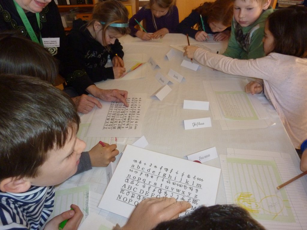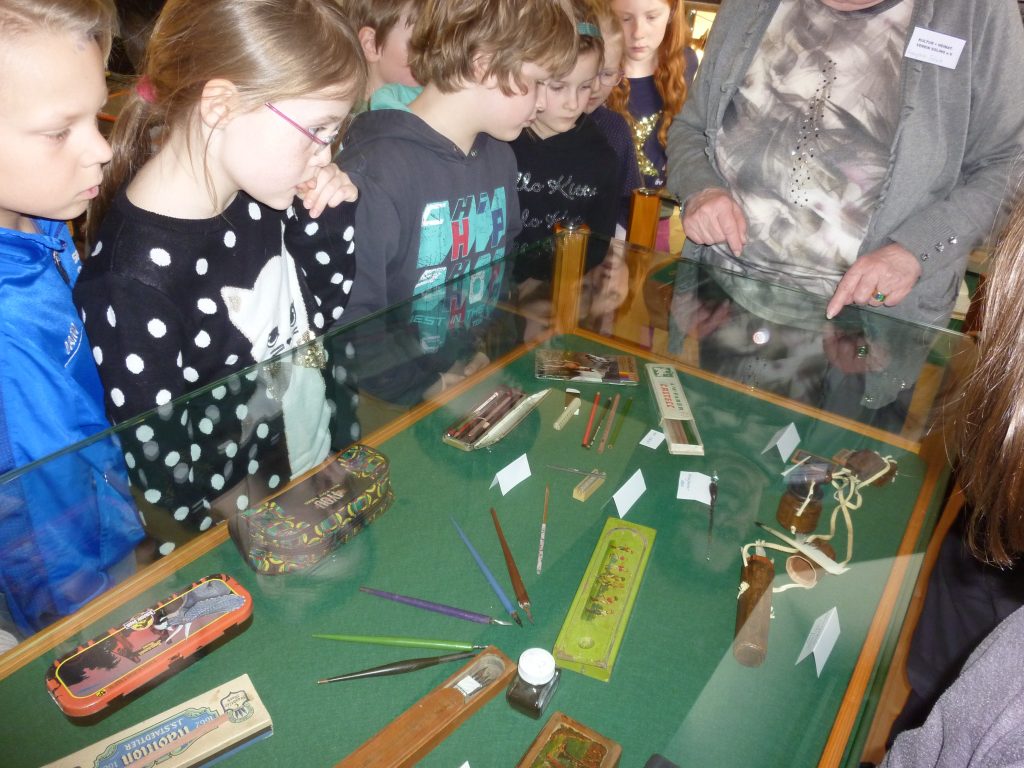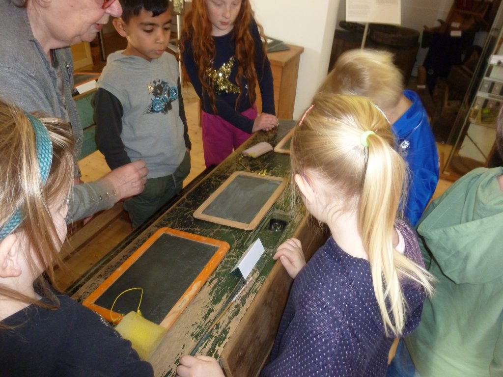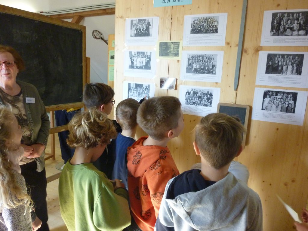 Wie war es wohl in der Schule, als Oma und Opa die Schulbank drückten? Was haben sie gelernt? Wie sah ein Schulranzen oder ein Schulbuch früher aus? Im Rahmen des HSU-Unterrichts hatten die Kinder viele Fragen zur Geschichte. Da kam es gerade recht, dass im örtlichen Heimatmuseum eine aktuelle Ausstellung zum Thema „Schule früher“ angeboten wurde. Also begaben sich die Kinder auf Zeitreise und statteten dem Museum, das ja gleich nebenan liegt, einen Besuch ab. Dort wurden die Kinder schon von Mitgliedern des Heimatmuseumsvereins erwartet, die berichten konnten, wie es früher in der Schule war. Toll war, dass vieles angefasst und ausprobiert werden durfte. Es war eine besondere Erfahrung mit einem Griffel auf einer Schiefertafel zu schreiben und in einer Schulbank zu sitzen. Viele Kinder zeigten Ehrgeiz die alte Sütterlin-Schrift zu lesen und selbst zu schreiben. Die ausgestellten Schriftstücke und Schreibwerkzeuge waren sehr interessant. Nachdem erzählt wurde, welche Strafen unartige Kinder erwarteten und wie viel die Kinder zu Hause arbeiten mussten und wenig Zeit zum Spielen hatten, meinte doch so mancher: „Zum Glück bin ich heute und nicht damals ein Schulkind!“ Auf jeden Fall waren es neue und interessante Eindrücke. Vielen Dank dafür!