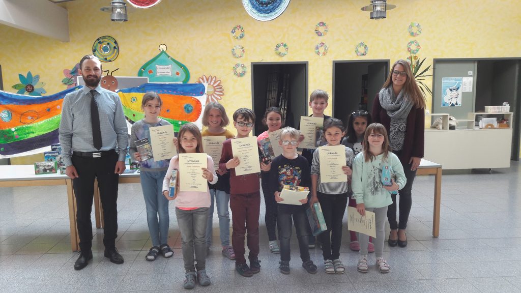 Die glücklichen Gewinner des Malwettbewerbes freuen sich über ihre Geschenke und Urkunde. Der Jury fiel es auch dieses Jahr wieder sehr schwer auszuwählen, welches der Bilder einen Sonderpreis gewinnen soll. Alle Kinder gaben sich nämlich sehr viel Mühe. Deshalb wartete auf alle Schülerinnen und Schüler ein Trostpreis, so dass keiner leer ausging. Herzlichen Dank der örtlichen Raiffeisenbank für die Spende!